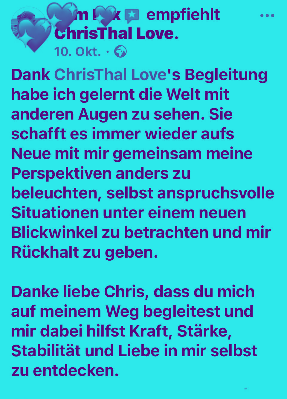Marie B.: "Mein Mann hatte eine Affäre, er meinte, dass er sich verliebt hat. Mir hat das den Boden unter den Füssen weggezogen. Chris hat es geschafft, mir wieder Boden zu geben. Ich fand durch das Coaching und die Module wieder zu mir selber, lernte mich an erste Stelle zu setzen und mich selber zu lieben. Ich stand wieder für mich selber ein. Mein Mann war während dieser schweren Zeit trotzdem immer für mich da und es stellte sich heraus, dass er immer für mich da ist. Inzwischen feierten wir unseren 30ten Hochzeitstag, haben einen viel liebevolleren, respektvolleren Umgang, haben gemeinsame Pläne und stehen da, wo wir am Anfang unserer Ehe standen. Danke an Chris."